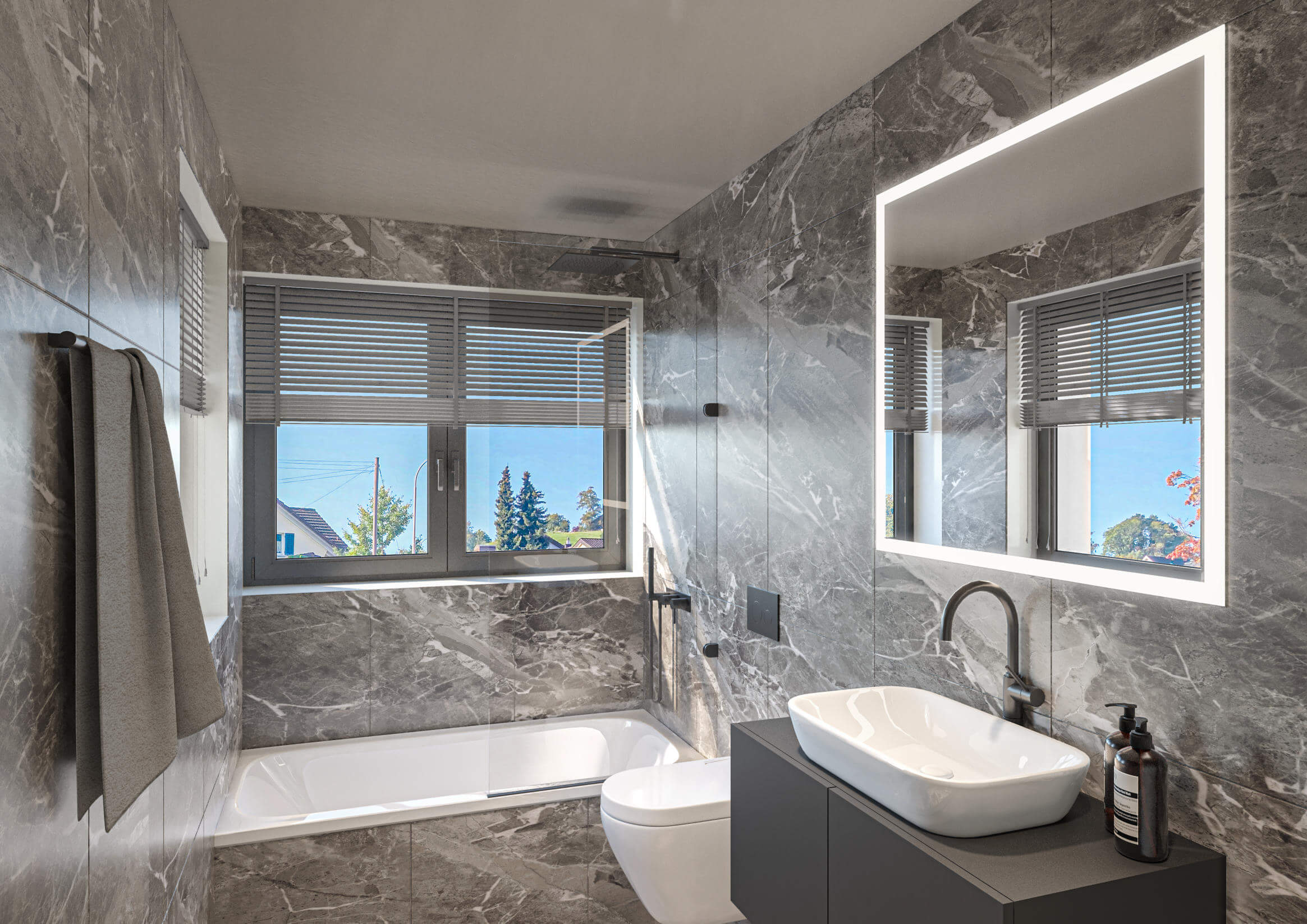 Alle genannten Informationen sind unverbindlich. Projektänderungen, Layoutanpassungen und Abweichungen der Materialien und Möbel in den dargestellten Visualisierungen bleiben bis zur Bauvollendung vorbehalten. Die einzigen verbindlichen Informationen sind die Angaben im Kaufvertrag und in dessen Anhänge.